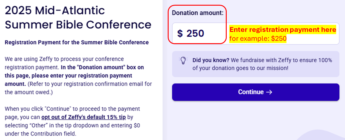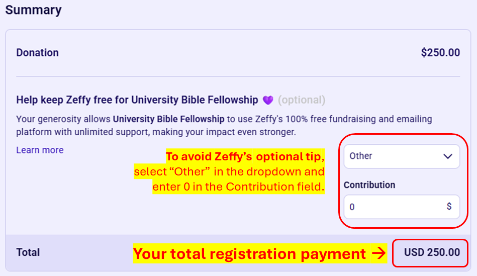 Note: Zeffy accepts optional tips. To avoid being charged the default 15% tip, select “Other” in the tip section and enter $0 if you do not wish to add a tip. You may pay using a credit card, debit card, or ACH. However, ACH is not recommended, as any refunds (if applicable) may take 2–3 months to process.